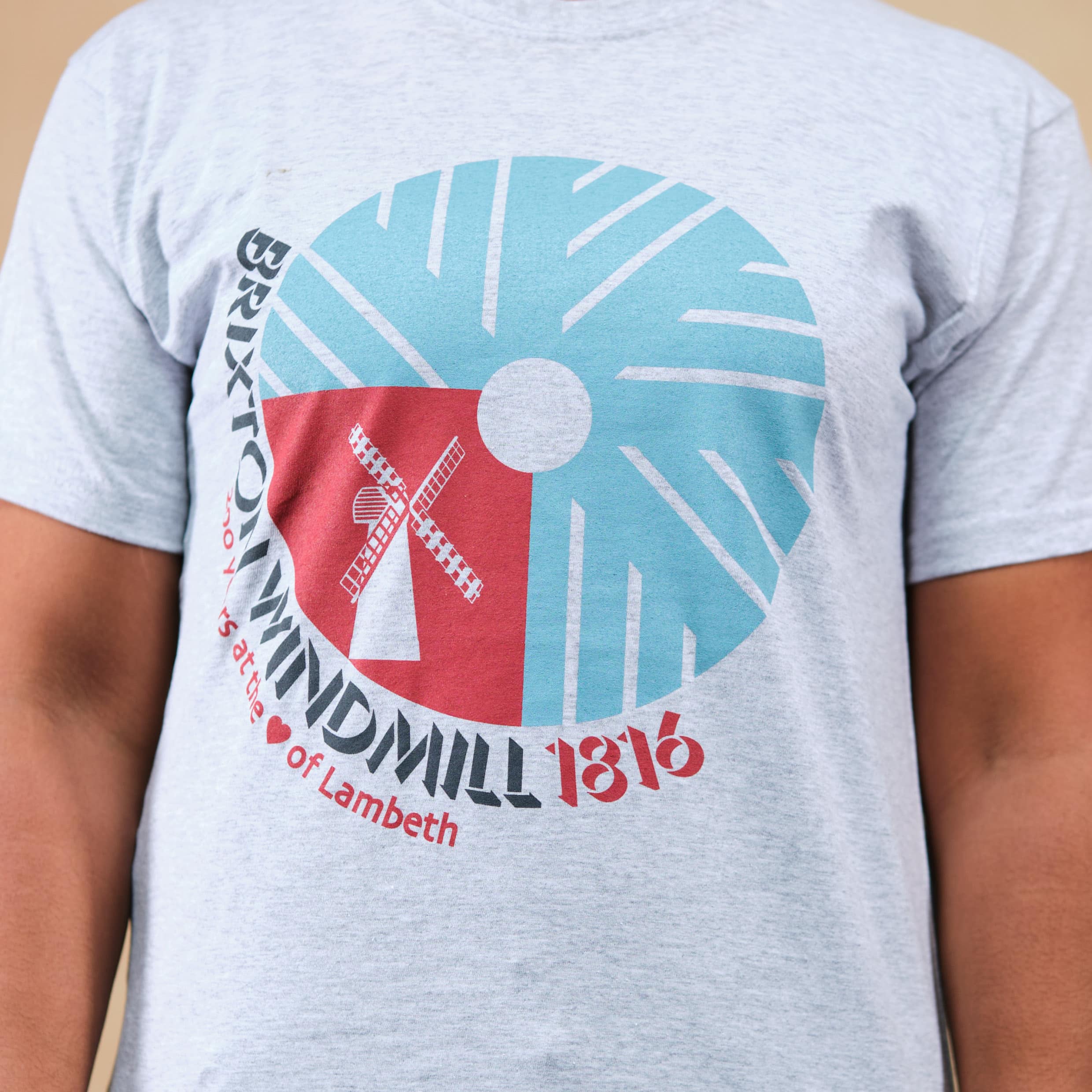 The geometric design on our high-quality millstone T-shirt is inspired by the pattern of furrows on the millstone here at Brixton Windmill.