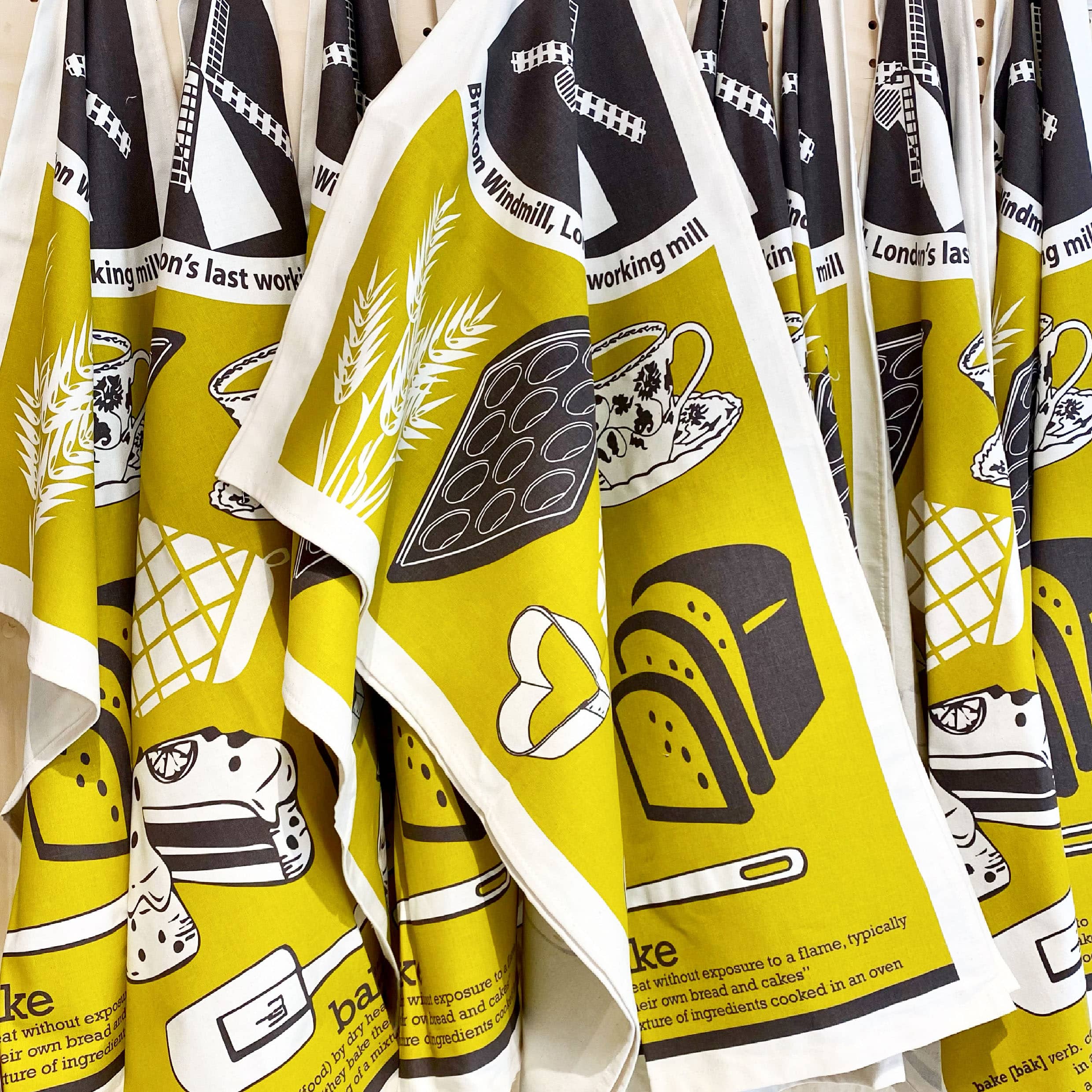 Our eco-friendly cotton tea towel features illustrations on a baking theme with a retro twist, making it a stylish gift for windmill enthusiasts or those that love cooking and baking.