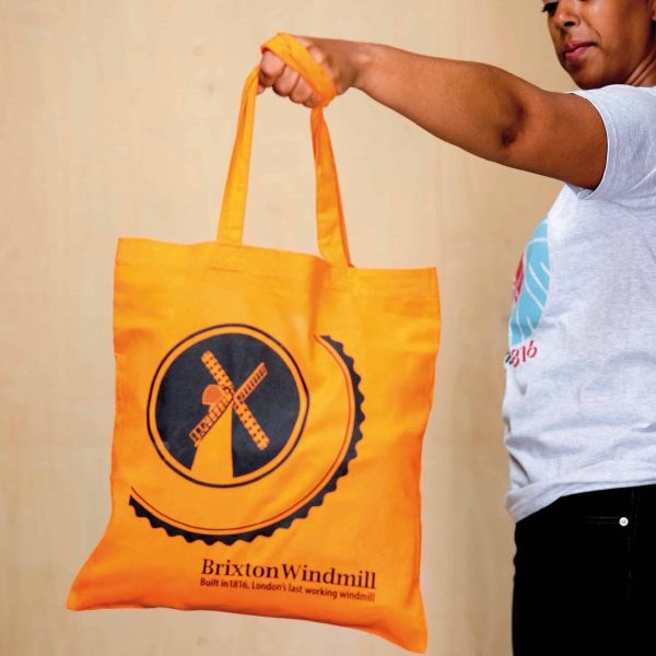 Say no to plastic – do your bit for the the environment with this stylish mid orange eco-friendly Brixton Windmill tote bag., designed to compliment our green and grey ‘heart’ design bags.